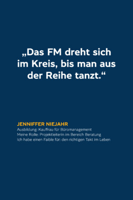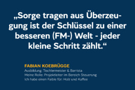 Begib dich mit uns in das Abenteuer Facility Management. Bei uns bewältigst du dieses aber nicht alleine, sondern wir erleben dieses gemeinsam in einem Team aus den unterschiedlichsten Disziplinen. Für uns ist Facility Management mehr als bloß eine Aufgabe – wir haben ein Ziel: ein Gebäudeerlebnis zu schaffen, das die Vielfalt der Bedürfnisse seitens der Nutzer, Betreiber und Kunden aufzunehmen und darzustellen weiß.